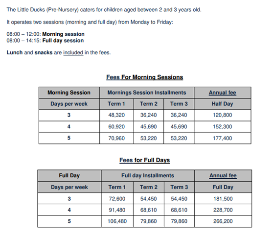 除了常规入学学生之外,BISP还特别针对2-3岁年龄段的孩子提供托儿所,托儿所的收费标准见下表: