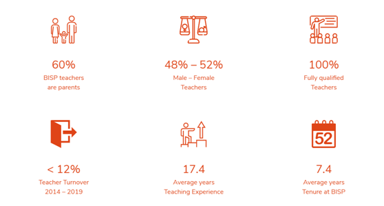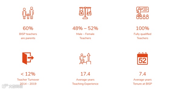 BISP不仅是普吉岛上学生数量最多的国际学校,她也是教师人数最多的国际学习,全校共有110位教师,来自16个不同国家,教师的平均任教经历为17.4年,而最重要的是这里教师在本校的平均任教经历达到了惊人的7.4年,也就是说BISP的老师的跳槽率非常低,这是保证教学质量的关键因素。
