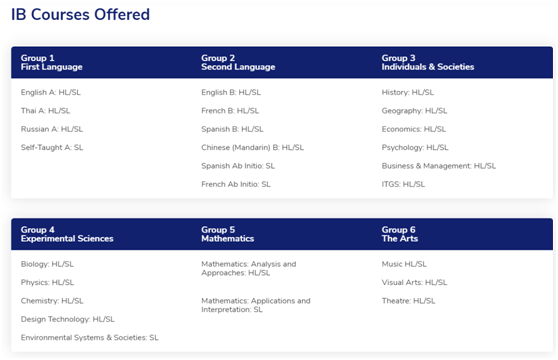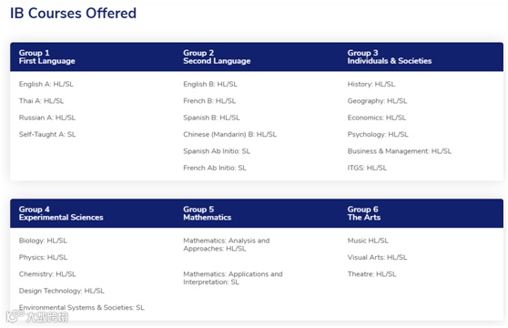 强大的师资力量保证每个学生都可以获得最好的教育以及个性化的发展,学校采用英国IB教育课程,BISP提供英语泰语俄语的IB课程,同时也提供法语西班牙语和中文的第二语言IB课程。由于IB课程由国际文凭组织设立的被全球大学认可的国际化课程,学生最终以IBDP的得分来申请不同的大学,具体IB课程的细节我就不再详细介绍的,主要课程见下图即可。