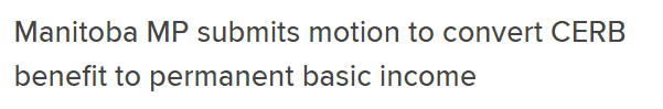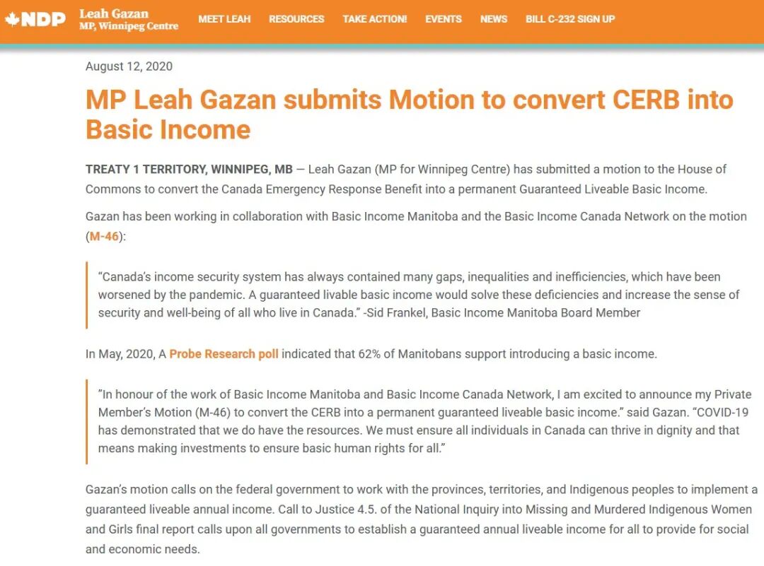 曼尼托巴的国会议员LeahGazan已经正式向国会动议,《46号法案》(Motion-46)要求将(CERB)转为永久性基本收入,给所有加拿大人(不用工作)每人每月发2000加币。