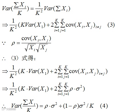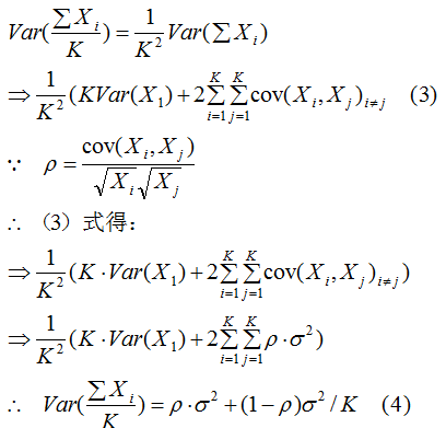 因为bagging的子数据集既不是相互独立的,也不是完全一样的,子数据集间存在一定的相似性,因此,bagging法模型的方差介于(1)(2)式两者之间。