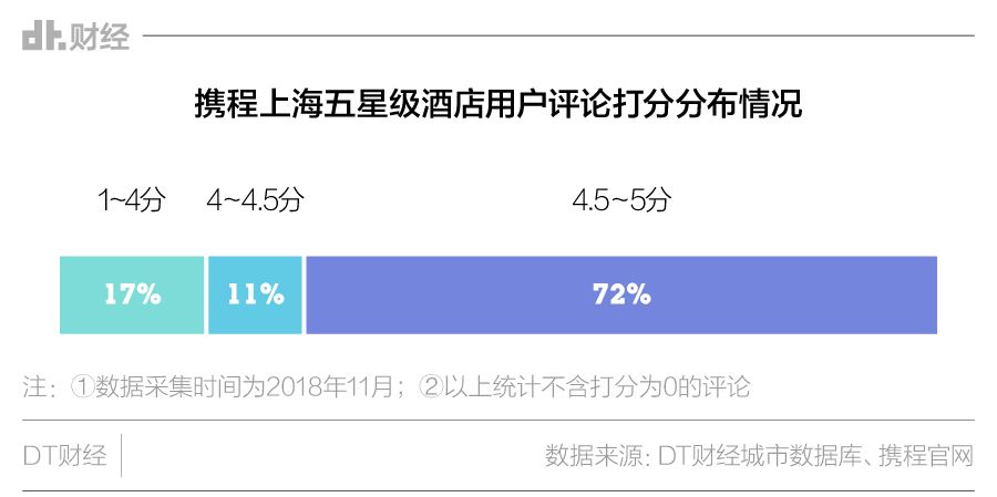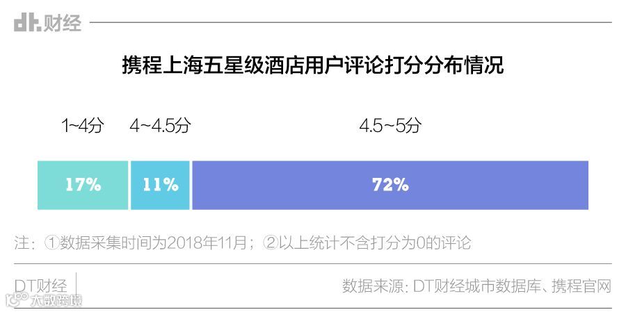 从我们采集的评论数据来看,房客们在APP上对酒店打出的评分分布在1-5分之间,4分是“差评”的分界线。在上海五星级酒店的有效评论中,有17%低于或等于4分,另有11%在4-4.5分之间。