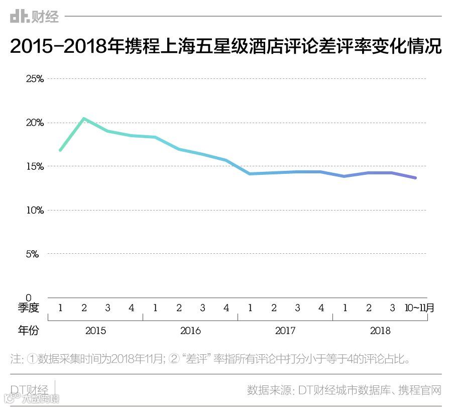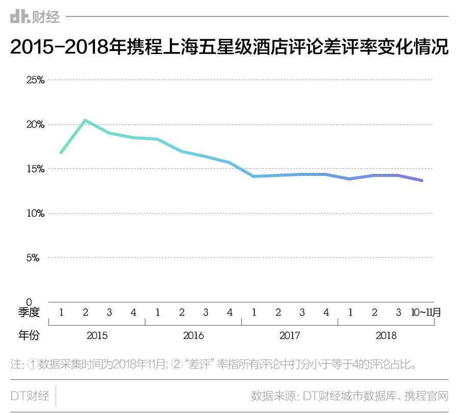 在这次突然“臭名昭著”之前,五星级酒店原本正在揽获更多“芳心”,从DT君(公众号ID:DTcaijing)采集的评论数据来看,自2015年二季度以来,上海五星级酒店的差评比例正在逐步降低,近两年稳定在14%左右。