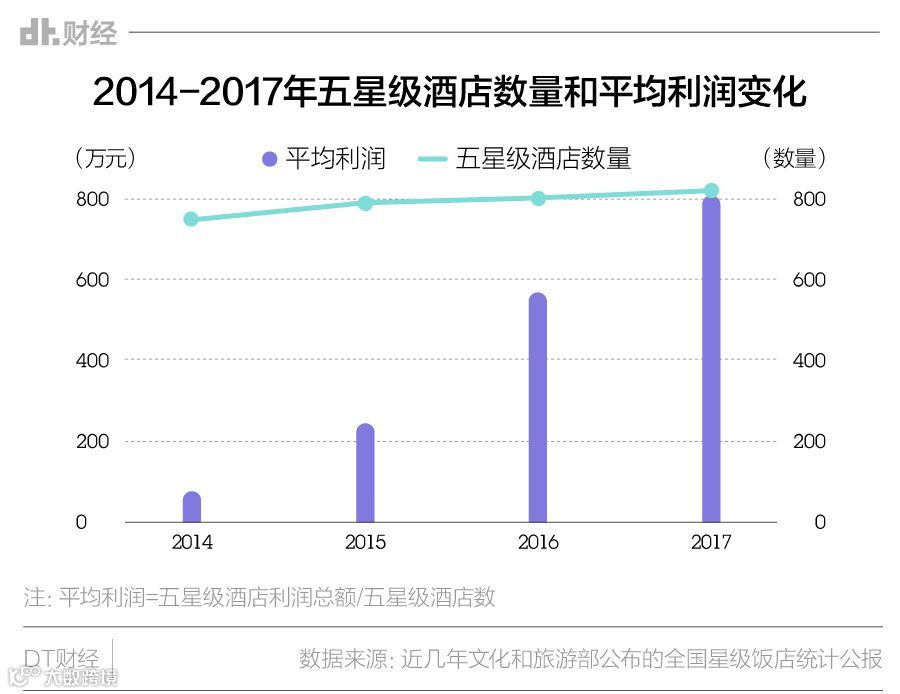 2017年,全国五星级酒店的利润总额达65.57亿元,占整个酒店行业盈利的90%,平均每家五星级酒店利润超过800万,同比上涨超过四成。