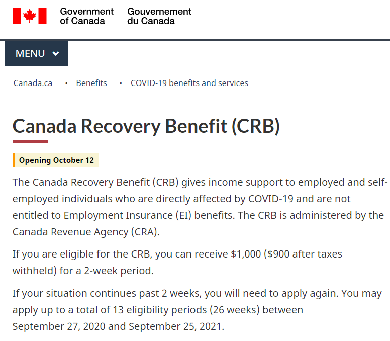 如果没有资格获得CRB,如果仍然需要财务支持,政府建议查看COVID-19福利和服务中的其他选项。
