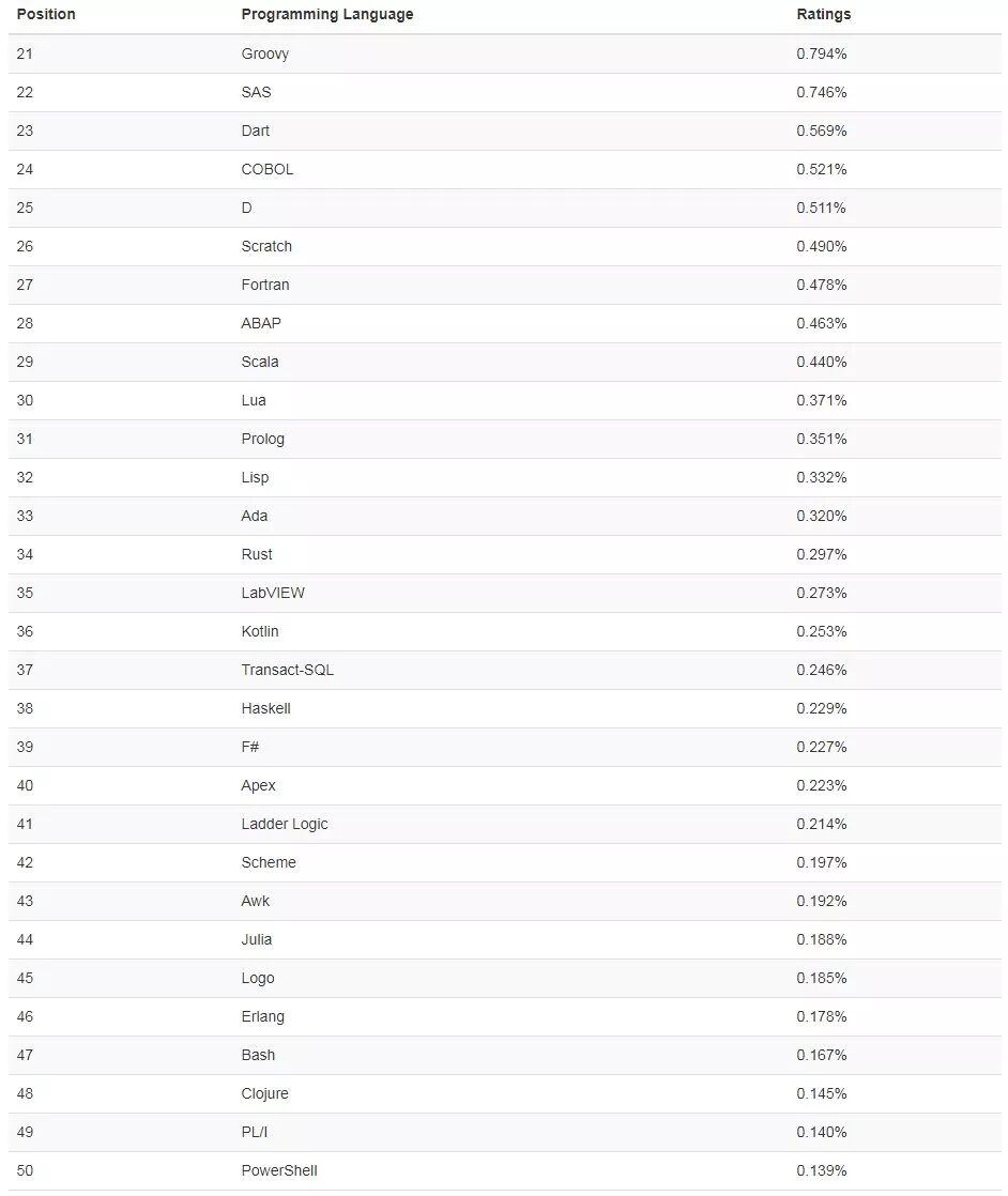 值得注意的是,TIOBE 指数并不代表语言的好坏,开发者可以使用该榜单检查自身的编程技能是否需要更新,或者在开始构建新软件时对某一语言做出选择。