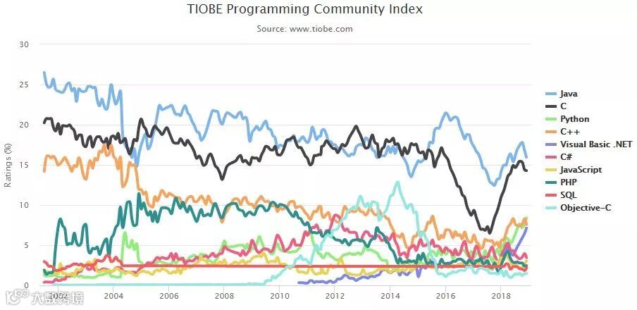 TOP 10 编程语言 TIOBE 指数走势(2002-2018)