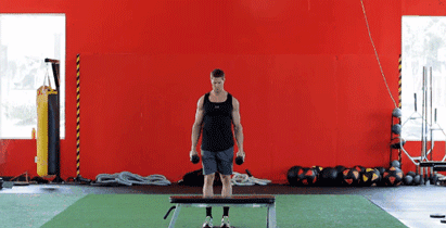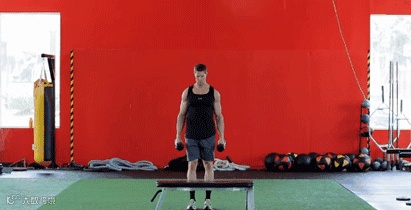 你以为推举就只能按在凳子上不动吗?不不,你可以加一点好玩的东西在里面。最常见的就是上台阶(箱子),将全身重量放到一条腿上,身体往上。然后站在箱子上做一个推举。Ok,下来。