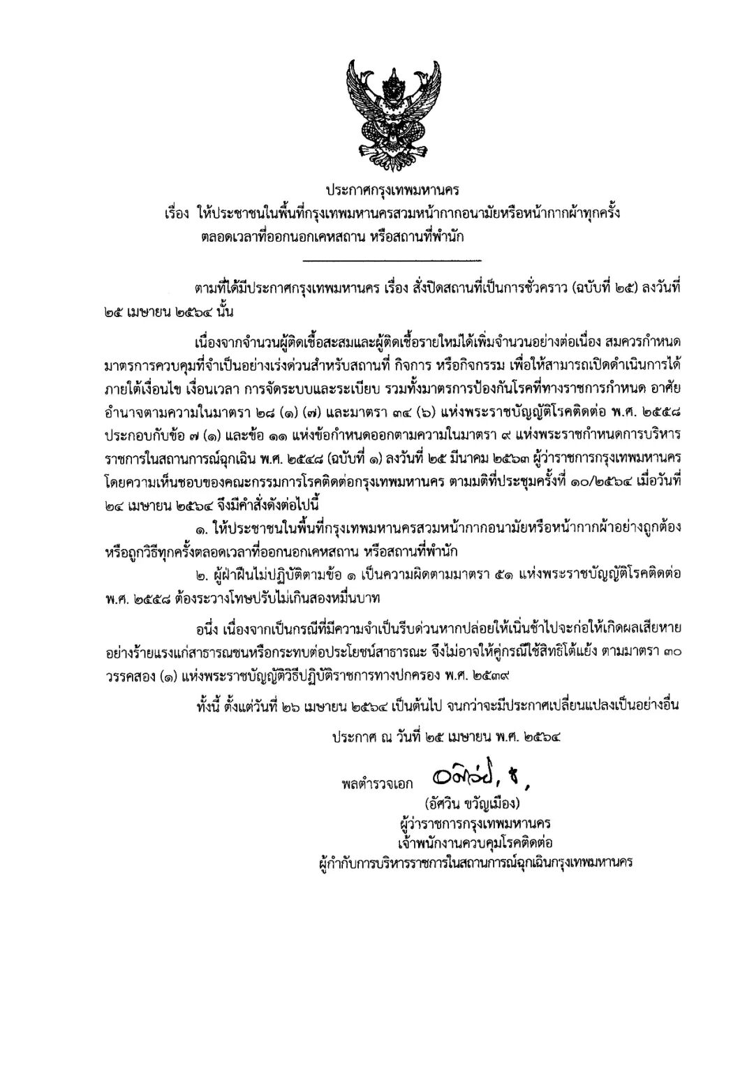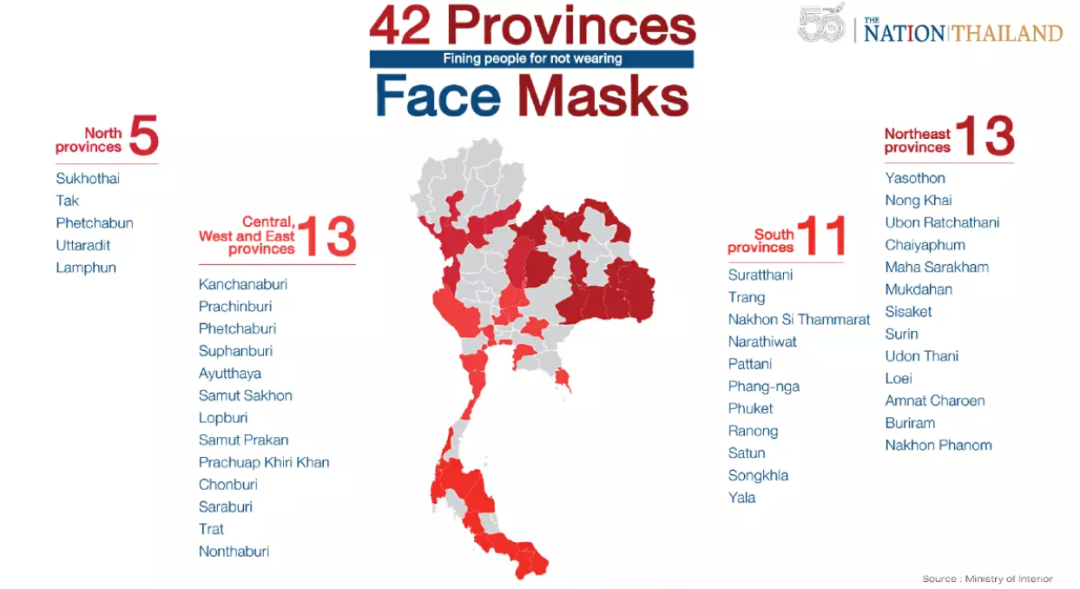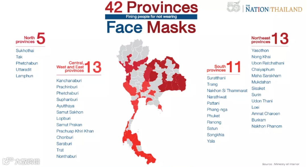 此外泰国77个府中有45个出台了在公共场合必须戴口罩的命令,根据《传染病法》的要求,违反该命令的罚款最高为20,000泰铢。