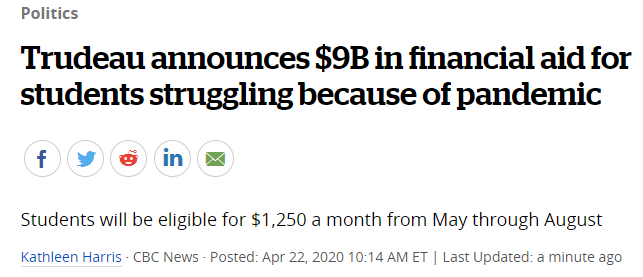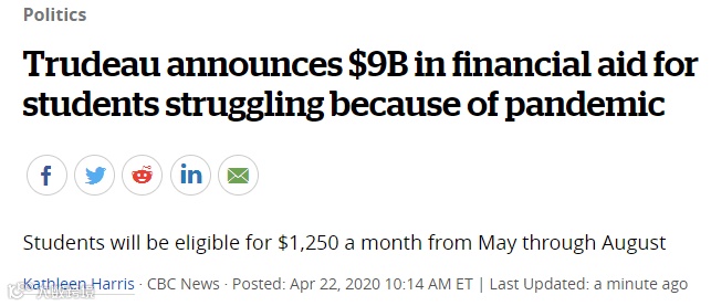 总理特鲁多刚刚宣布,加拿大将发放紧急学生补贴总计金额90亿加币。每个学生每月可领$1,250!申请条件非常宽松。