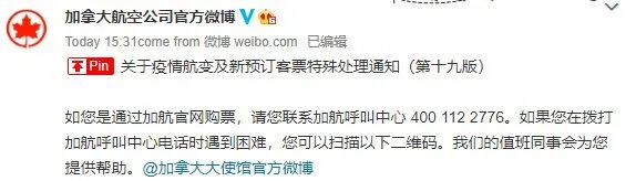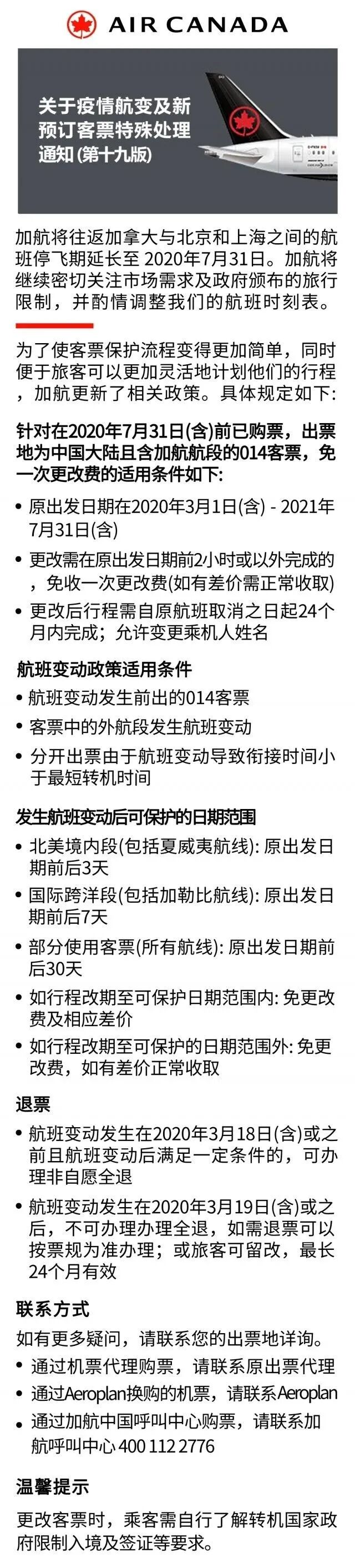 最近,大家最关心的加拿大复飞中国的航班最近也有了新进展,加拿大航空7月1日在官方微博上发出关于疫情航班变动及新预订机票特殊处理通知(第十九版),将往返加拿大与北京、上海航班停飞期延长至2020年7月31日。