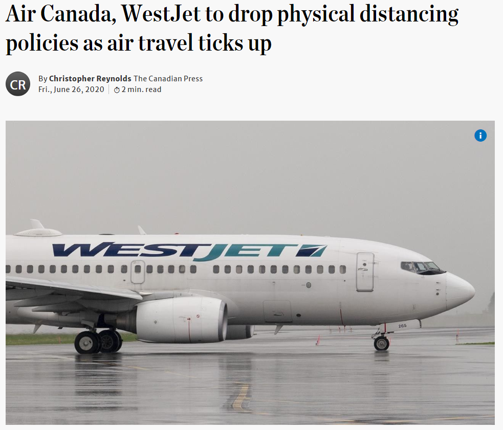 从7月份开始,加航、西捷航空就已经取消飞行中的社交距离政策,从7月1日起开始恢复出售邻座机票。