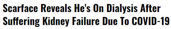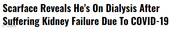 美国著名歌手Scarface新冠肺炎症状均已消失,但因新冠肺炎导致肾衰竭,正接受透析治疗。肾脏损伤的恢复恐怕遥遥无期。