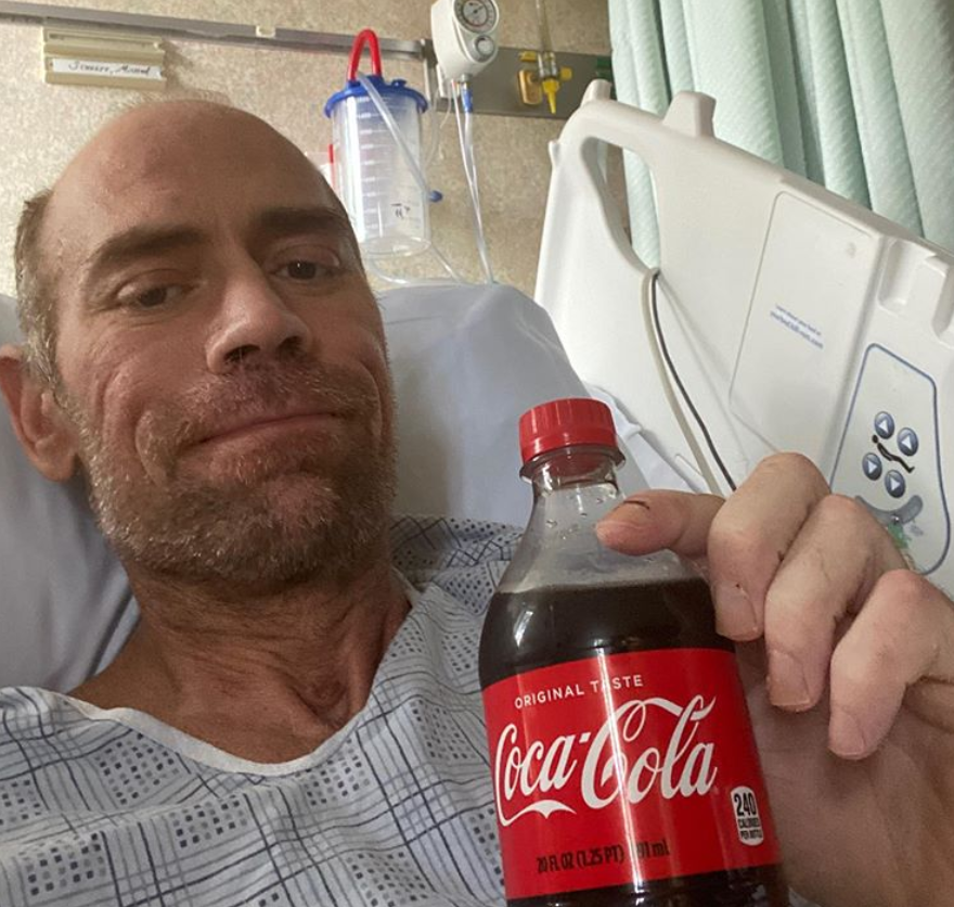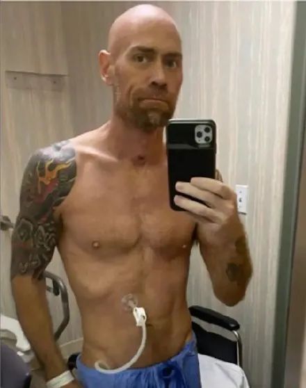 从这张体型对比照可以看出,感染前他是大胸腹肌粗壮男,生病后很快就被病毒榨干成了皮包骨身材。真的太残酷了!