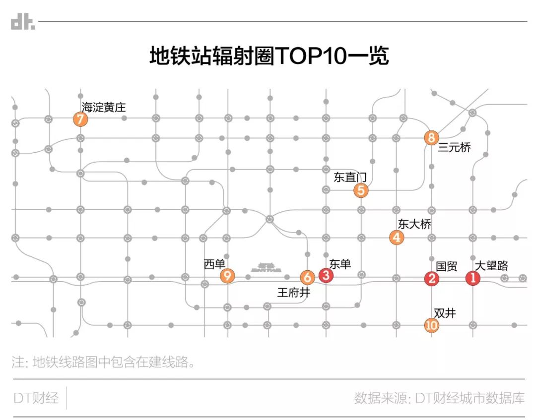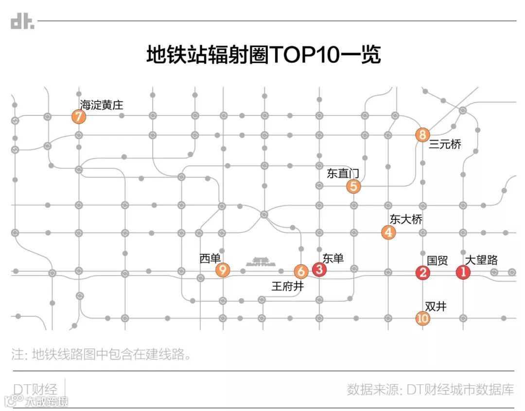 在《报告》对北京405个地铁站辐射圈的综合排名中,位于朝阳区的大望路站夺得第一,国贸、东单、东大桥、东直门、王府井、海淀黄庄、三元桥、西单与双井站分列二至十名。