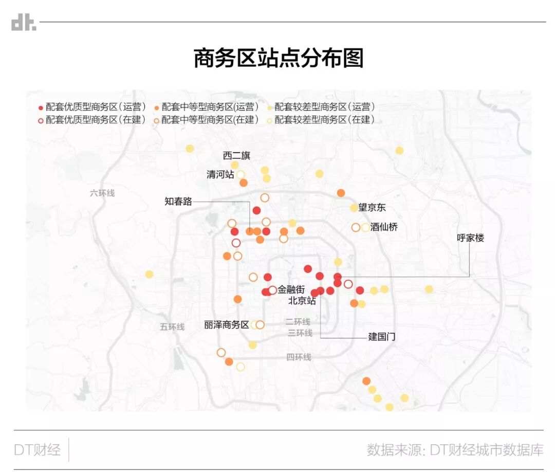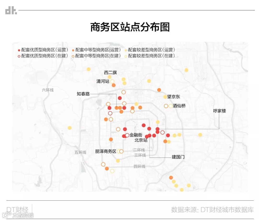 北京的商务类站点集中在东三环内和北城的中关村区域,并在地铁1号线和10号线沿线呈现出“扎堆”的现象。10号线上有12个商务型站点,配套优质站点主要分布在西北角以及东段的国贸站-呼家楼站区域。1号线上有7个成为商务站点,配套优质站点分布在国贸CBD及金融街周边。