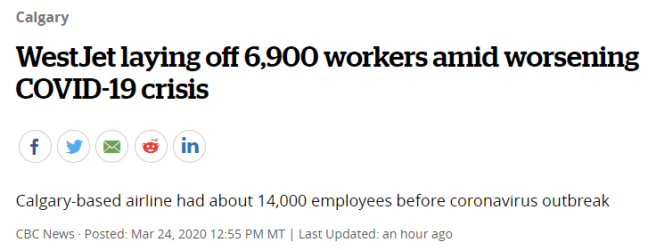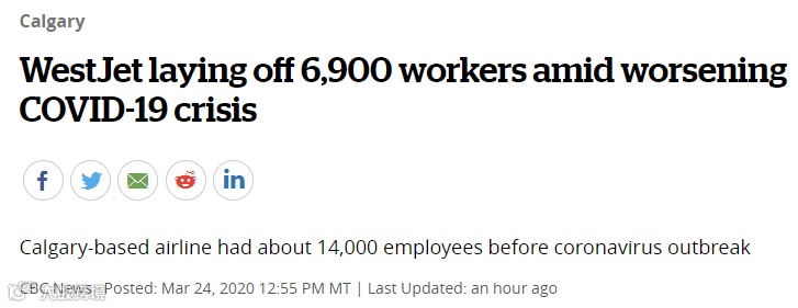 继加航两天前宣布裁员5100人后,今天,加拿大西捷航空宣布裁员6900人!被裁员的人数约占公司员工总数的一半。