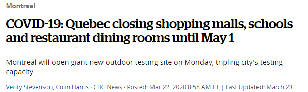 从周二凌晨开始,魁省所有的非必需商业将全部关闭,商场和餐厅预计到5月1日方能恢复正常营业。而杂货店、药方、加油站等基本服务设施将保持开放。