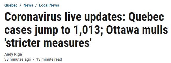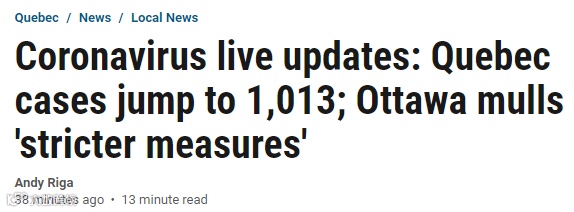 如今,魁省以累计确诊人数1013人的"成绩"超过了安省和BC省,成为加拿大境内确诊新冠肺炎患者人数最多的地区。