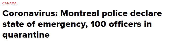 另一方面,近日有消息传出在蒙特利尔,有100名警官疑似感染新冠病毒正在进行隔离。