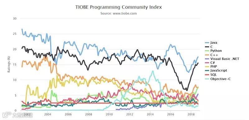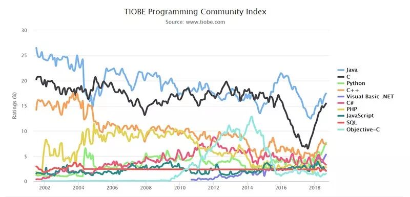 Top 10 编程语言 TIOBE 指数走势(2002-2018)