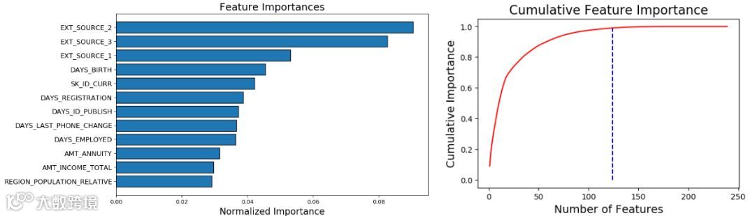 左图给出了 plot_n 最重要的特征(重要度进行了归一化,总和为 1)。右图是对应特征数量的累积重要度。蓝色竖线标出了累积重要度为 99% 的阈值。