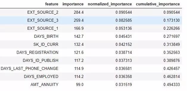 我们也可以在一个 dataframe 中查看所有特征重要度: