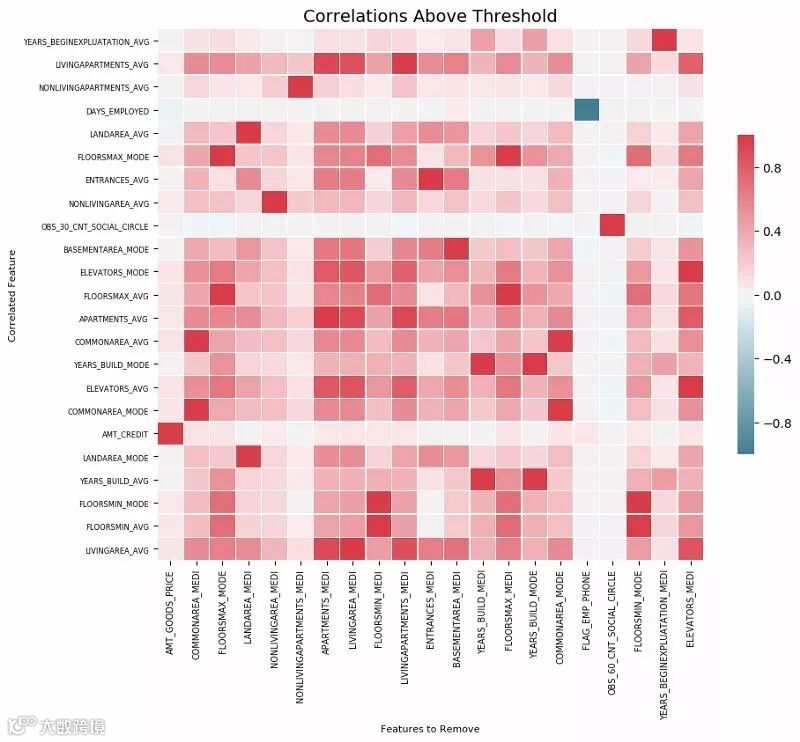 使用热图可以很好地可视化共线性。下图展示了所有至少有一个相关关系(correlation)超过阈值的特征: