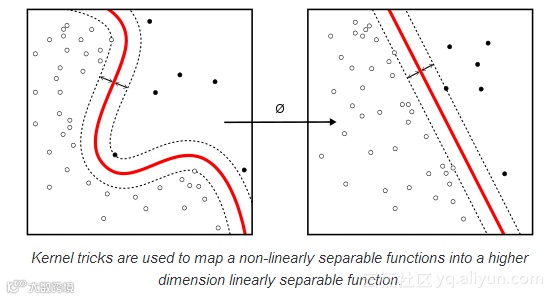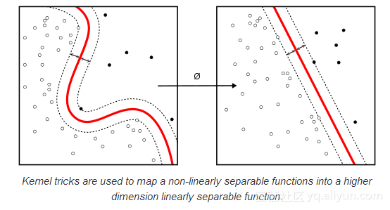 当类不可线性分离时,可以使用核机制将非线性可分离空间映射到更高维度的线性可分离空间。