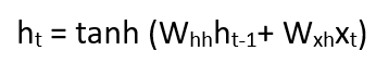 现在试着以简单的方式定义 f()。我们使用 tanh 激活函数。通过矩阵 W_hh 定义权重,通过矩阵 W_xh 定义输入。公式如下所示: