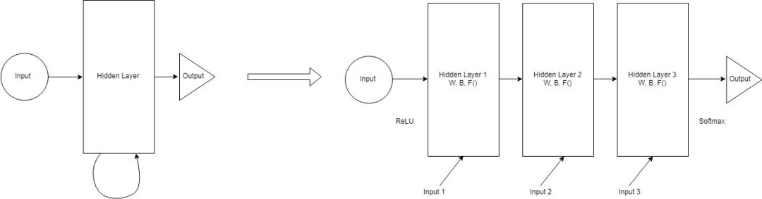 现在我们就可以将所有层合并在一起了。所有的隐藏层都可以结合在一个循环层中。所以看起来就像下图: