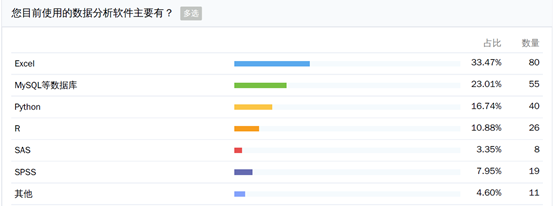 针对101名CDA数据分析就业班的毕业学员做回访调查,其中有一项是目前所使用的工具和技能,排在前三名的软件是:Excel、MySQL、Python。