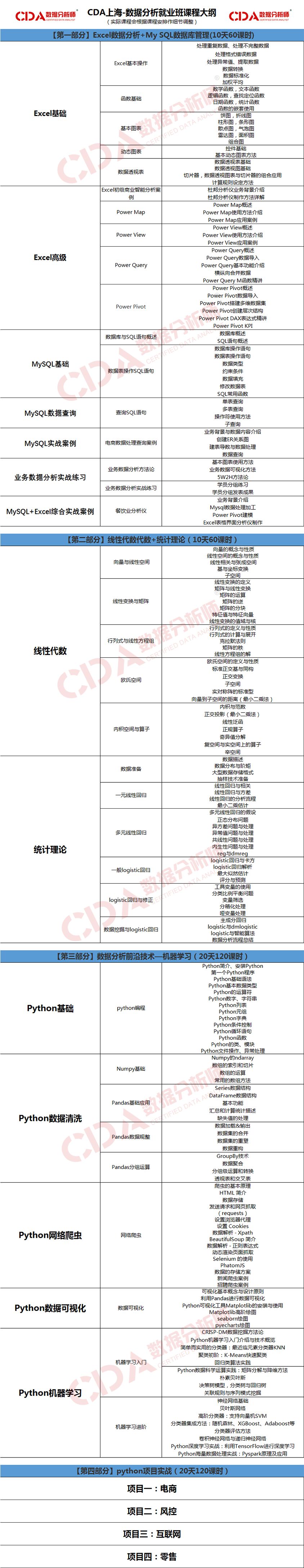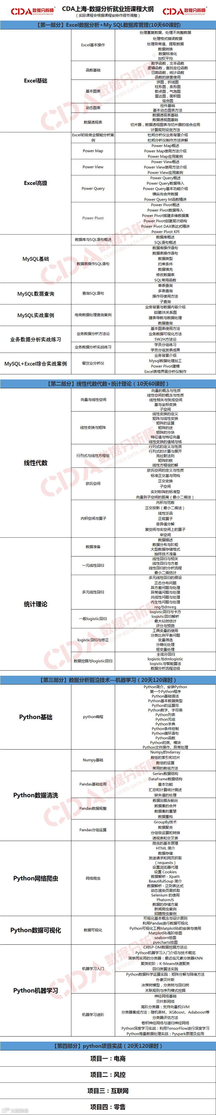因此,我们将CDA数据分析就业班进行内容升级,主要有以下几点:1.将软件化繁为简,主要学习Excel+MySQL+python三门软件,增加单个软件的学习时长,使得学员提高动手能力。2.增加数理统计和机器学习算法的学习时长,使得学员踏实的掌握理论知识。3.增加4个实战项目,每个项目为期7天,由老师给到真实数据和分析方向,学员用5天时间独立完成数据分析报告,再由老师用2天时间讲解项目流程以及在这个行业需要掌握的技能点;使得学员熟悉企业应用流程,增加项目经验。