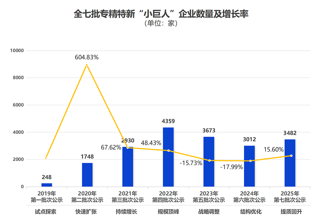 从2019年至今,工信部已累计开展七批国家级专精特新“小巨人”企业培育工作,其中2025年全国“小巨人”数量约为3482家,相比2024年新认定的3012家,增加470家,新认定数量增长约15.60%。