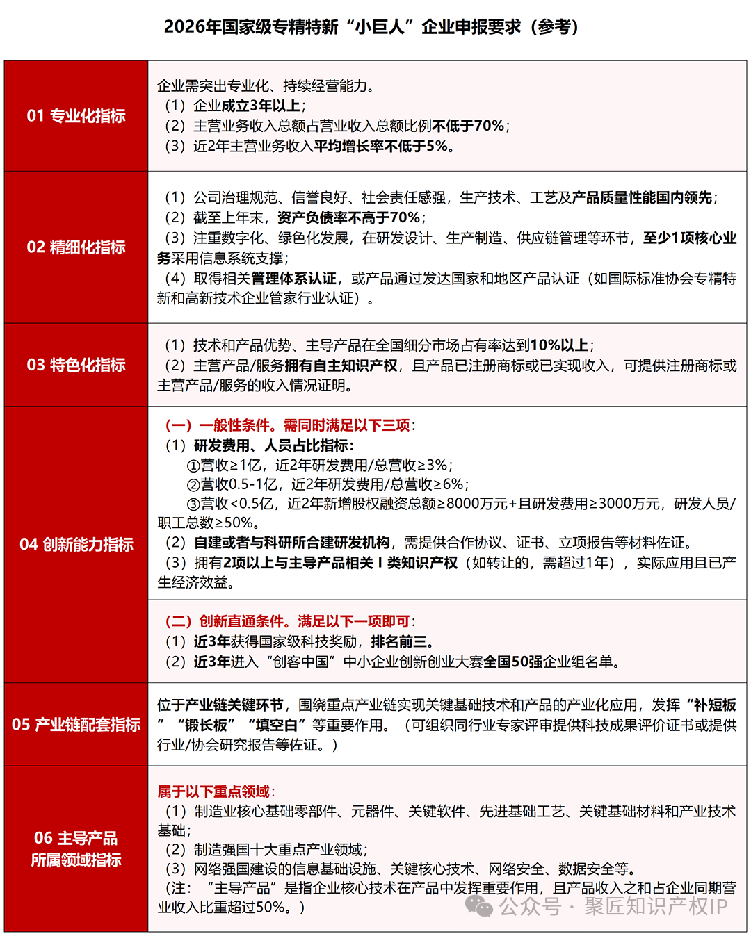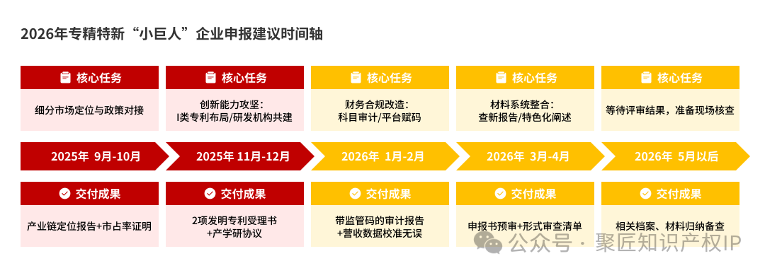 企业想要在2026年拿下专精特新小巨人的“金字招牌”,现在正是提前布局的黄金时期。但注意前提一定是企业已经成为专精特新中小企业,如果还没获得资格,现在务必进行申报认定!聚匠作为专业的“知产+科技项目+财税”三位一体的服务机构,已助力众多企业成功跻身专精特新行列。我们拥有丰富的申报经验和专业的服务团队,能够为您提供全方位的指导和支持。
