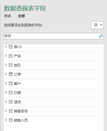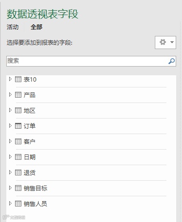这告诉我们,只要在分析中同时使用多个表,将自动使用数据模型来创建透视表。此时,Excel将可能用到的表都列了出来: