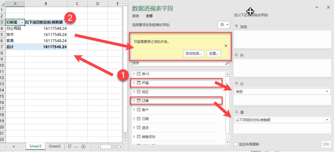 将字段放置在合适的位置后,可以看到透视表的计算结果并不符合预期,原因是系统并为自动完成诸如 VLOOKUP 的功能,这需要建立表之间的关系,如下: