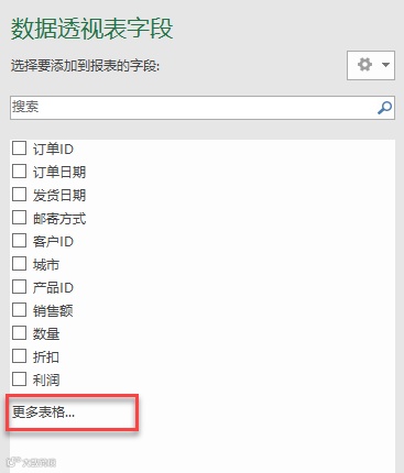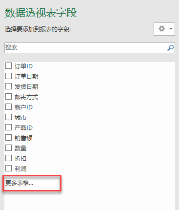 原来透视表知道我们可能找不到需要的字段,因此给了一个机会让此时可以从更多表格来重新选择。如下: