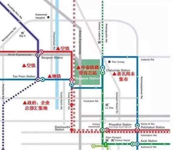 泰国商会房地产开发委员会主席Atip Bijanonda表示,Bang Sue地区周边的发展规划非常具有吸引力。而最有潜力的区域是在Bang Sue高铁总站方圆5公里内,这些地方将最大限度的承接利好。距离Bang sue站仅一个地铁站的Taopoon区,也随之成为一个新的投资热点,潜力巨大。