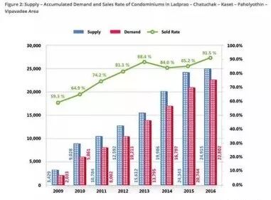 从上图我们可以看出,Bang sue周边地区供需一路攀升,2016年的去化率为91.5%,比起曼谷2016年全地区去化率平均81.3%的水平高出了10%个百分点。