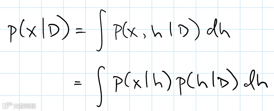 但是如果我们试着用近似方法求积分呢?如果按通常的独立同分布假设,我们可以利用这个事实:未来可能出现的数据样本值 x 条件独立于给定参数 h 时的观测值 D。