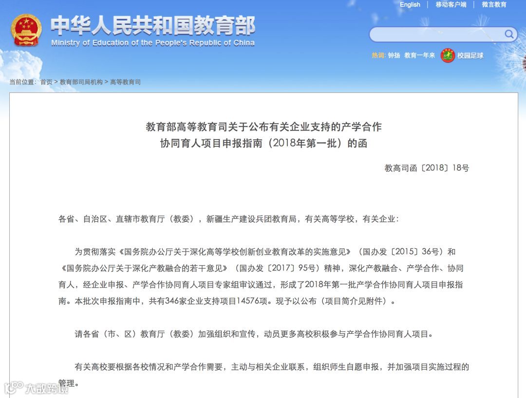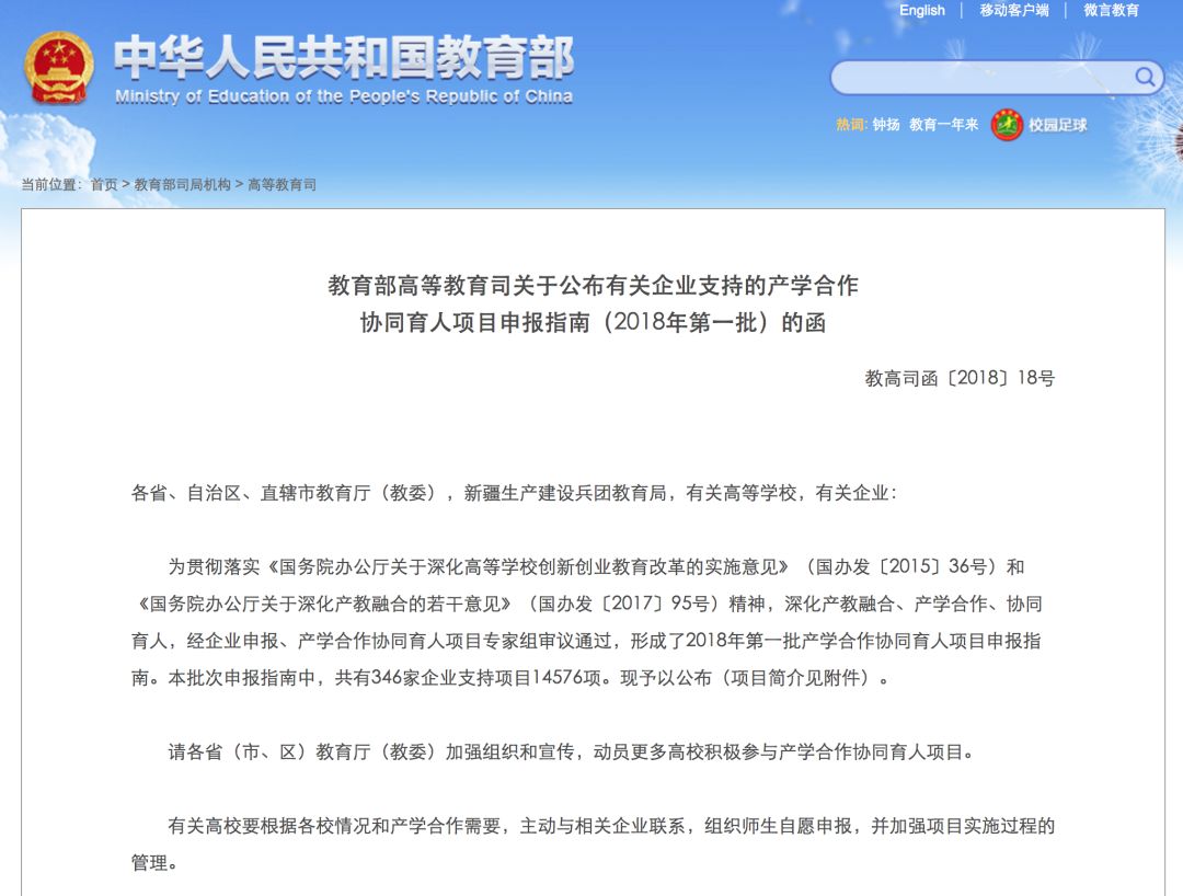 2018年4月28日,教育部高等教育司发函〔2018〕18号《教育部高等教育司关于公布有关企业支持的产学合作协同育人项目申报指南(2018年第一批)的函》。
