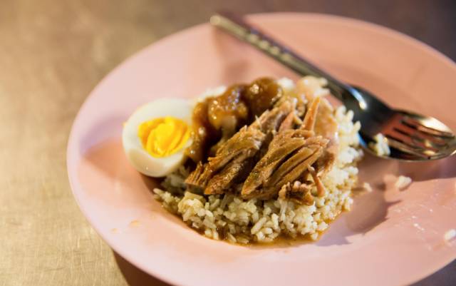 泰国的路边摊上除了小吃之外也有各种售卖简餐的摊位,猪脚炖得酥烂入味,配上半个溏心蛋吃,这样的猪脚饭着实诱人啊~