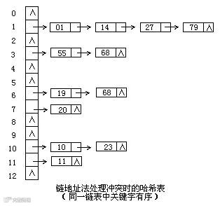 将所有关键字为同义词的记录存储在同一线性链表中。