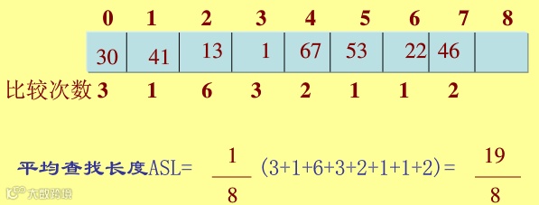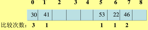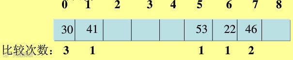 eg: 对给定数列{22,41,53,46,30,13,1,67}建立哈希表,表长取9,即[0-8]。哈希函数设定为H(key)=key MOD 8,用线性探测解决冲突Hi=(H(key)+di) MOD m,di=1,2,3,...m-1。(参考百度文库)