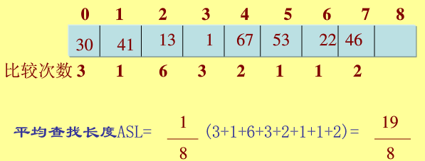 最后建立的哈希表如下所示,其中平均查找长度ASL如下。查找key=67,比较2次找到,查找成功;查找key=21,比较8次找不到,查找失败。