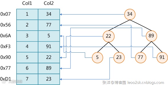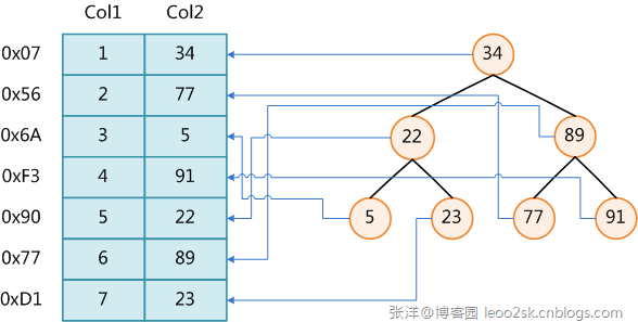 左边是数据表,一共有两列七条记录,最左边的是数据记录的物理地址(注意逻辑上相邻的记录在磁盘上也并不是一定物理相邻的)。为了加快Col2的查找,可以维护一个右边所示的二叉查找树,每个节点分别包含索引键值和一个指向对应数据记录物理地址的指针,这样就可以运用二叉查找在O(log2n)的复杂度内获取到相应数据。