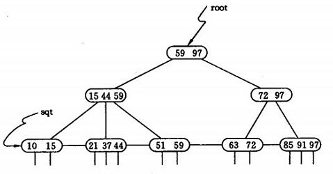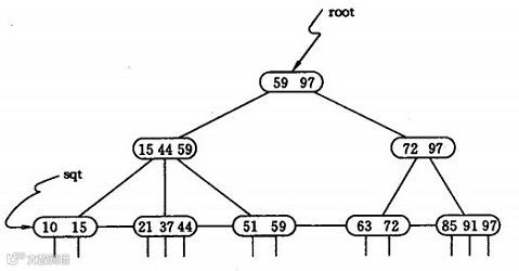 如图B+树中有两个头指针,一个指向根节点root,另一个指向关键字最小叶子结点sqt。因此可以对B+树进行两种查找运算:一是从根结点开始随机查找,二是从最小关键字起顺序查找。