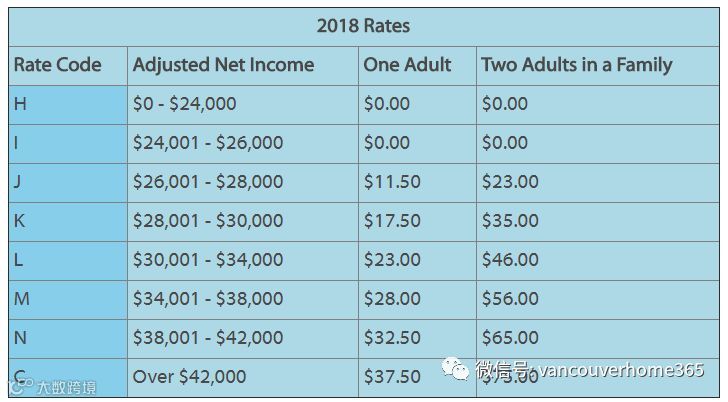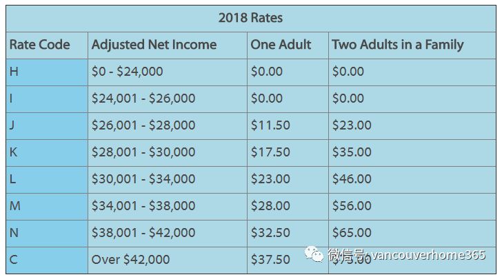 很多人都知道,MSP在2018年1月开始费用比之前减半,下图就是目前BC省居民需要交的保险费用(根据不同收入水平收费不同),只有年收入在2.6万以下的人群,才能享受免费的政策。