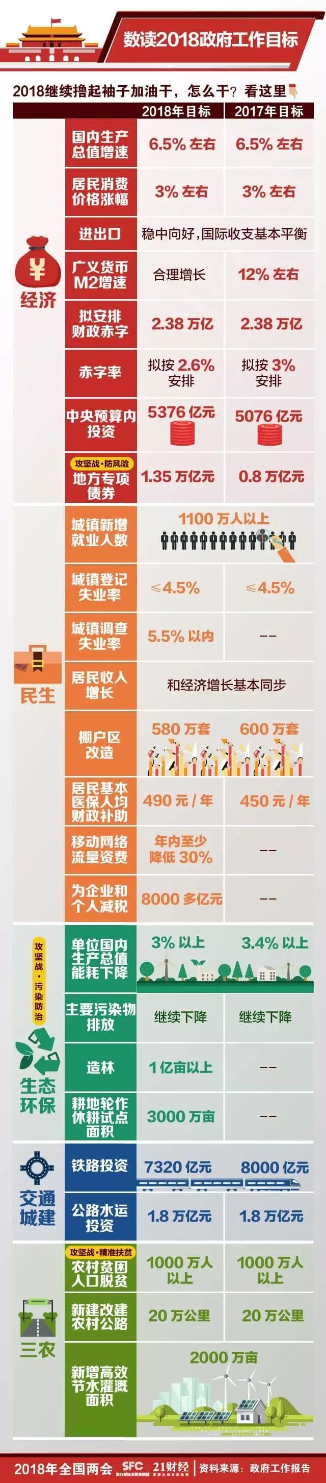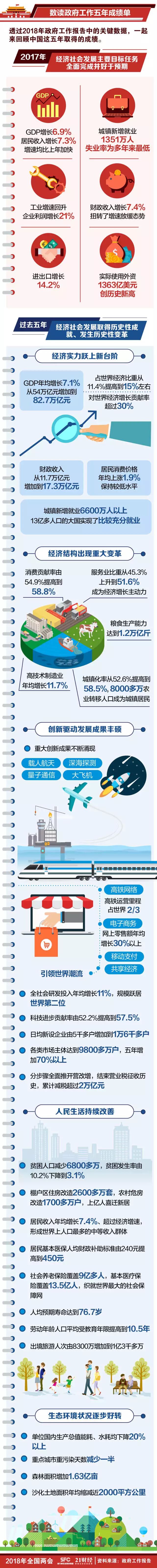 2018年GDP增速目标6.5%左右,中国高铁运营里程占世界2/3,取消流量漫游费,大病保险制度基本建立,人均预期寿命达到76.7岁…